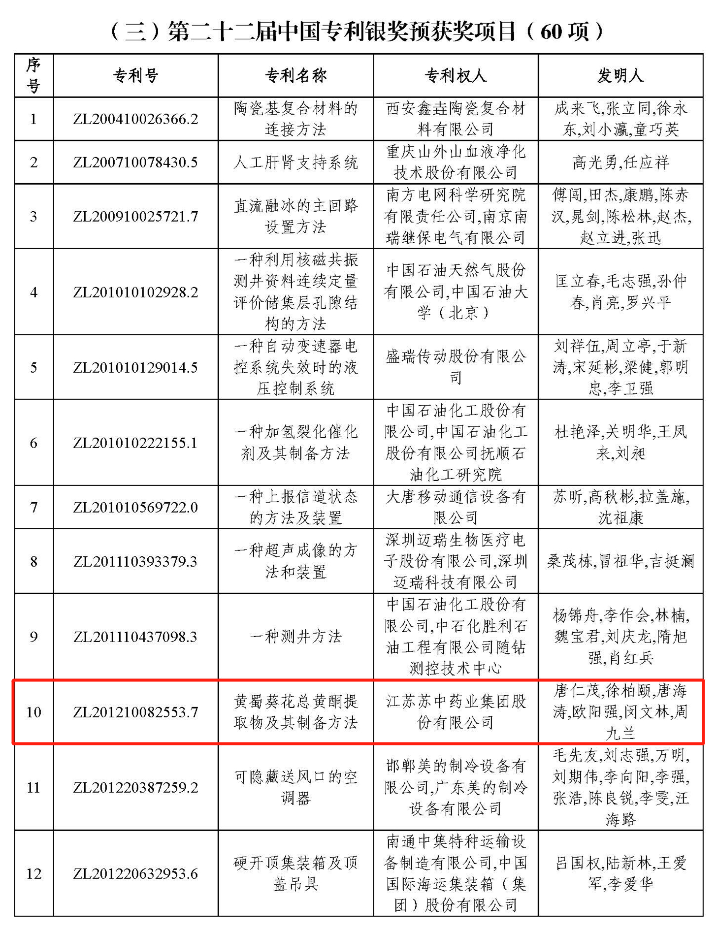 5月10日,根據(jù)國(guó)家知識(shí)產(chǎn)權(quán)局專(zhuān)利局“第二十二屆中國(guó)專(zhuān)利獎(jiǎng)評(píng)審結(jié)果公示”通知,蘇中藥業(yè)黃葵膠囊相關(guān)專(zhuān)利“ZL201210082553.7,黃蜀葵花總黃酮提取物及其制備方法”,入圍中國(guó)專(zhuān)利獎(jiǎng)銀獎(jiǎng)。