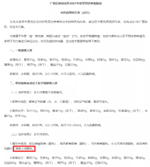 8月13日,廣西壯族自治區(qū)印發(fā)《廣西壯族自治區(qū)2021年新型冠狀病毒肺炎中醫(yī)藥預(yù)防方案(試行)》,蘇中藥業(yè)集團(tuán)獨(dú)家產(chǎn)品清宣止咳顆粒,被《方案(試行)》推薦為密切接觸者或處于醫(yī)學(xué)觀察期的兒童出現(xiàn)乏力伴發(fā)熱的癥狀時(shí)的用藥。