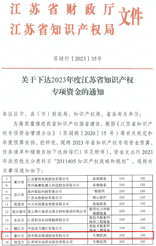 6月28日,江蘇省知識(shí)產(chǎn)權(quán)局發(fā)布“關(guān)于下達(dá)2023年度江蘇省知識(shí)產(chǎn)權(quán)專項(xiàng)資金的通知”,蘇中藥業(yè)集團(tuán)獲準(zhǔn)承擔(dān)2023年度江蘇省高價(jià)值專利培育計(jì)劃項(xiàng)目。
