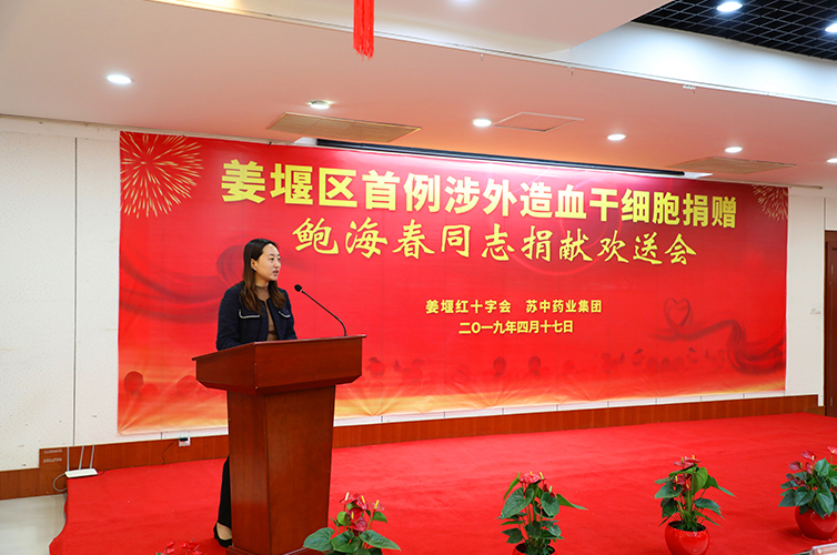 鮑海春的這次義舉得到了蘇中藥業(yè)領(lǐng)導(dǎo)和同事的全力支持。4月17日,區(qū)紅十會和近80名領(lǐng)導(dǎo)同事為他舉辦歡送儀式。歡送會由區(qū)紅十字會副會長夏軍主持,區(qū)政府陳莉區(qū)長、區(qū)紅十字會黨組書記黃海晏、副會長凌雨佳、蘇中藥業(yè)集團黨委副書記、工會主席朱善意,副總經(jīng)理何益民、祝紀文,造血干細胞捐獻志愿者鮑海春和他的同事及紅十字志愿者等出席儀式。鮑海春認為和一次普通的獻血一樣,并沒有什么了不起,是一次彌足珍貴的緣分。鮑海春說,“可以從死亡線上挽救一條鮮活的生命,是一件特別有意義的事情?!彼M约捍舜尉璜I不只是救一個人,而是動員更多人加入造血干細胞捐贈,奉獻愛心,讓愛“薪火相傳”。正如蘇中藥業(yè)黨委副書記朱善意在歡送會上的賦詩“蘇中文化大氣場,姜堰海春放光芒,不為利來不為名,只留情懷美名揚”。