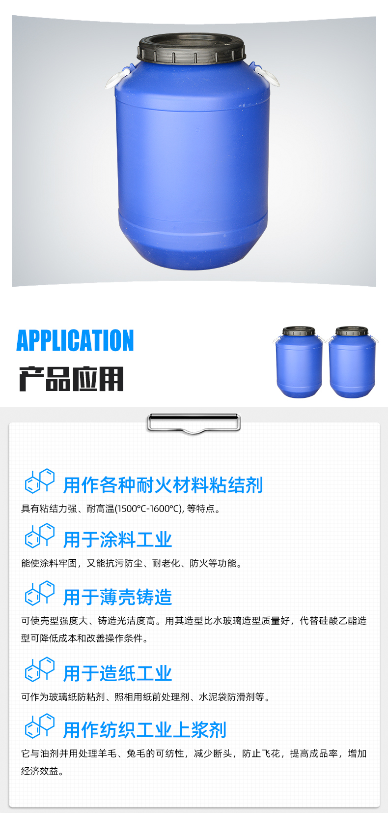 1、用作各種耐火材料粘結(jié)劑,具有粘結(jié)力強(qiáng)、耐高溫(1500~1600℃)等特點(diǎn)。